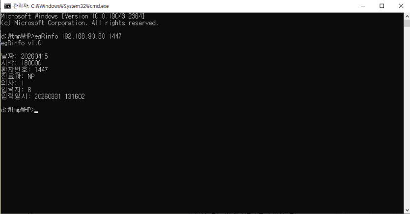 egRinfo 메뉴얼 페이지 정보 작성자 dranon 댓글 0건 조회 4회 작성일 26-04-15 15:44 목록 본문 이지스 예약번호를 이용해 예약입력 정보를 보여주는 프로그램.사용법: zip으로 묶인 파일을 적당한 디렉토리에 넣고 아래와 같이 실행한다. 아래의 예는 d:\tmp\HP 안에 파일을 풀고 실행한 경우이다.위의 창과 같이 실행하면 된다. 첫 번째 인자는 이지스의 서버 번호인데, 이지스의 [도구]-[환경설정] 에서 DB주소에서 알수 있다.두 번째 인자는 당일에 예약상태인 환자의 번호이다. 자신이 예약을 입력한 환자를 선택하여 환자 번호를 인자로 주면 이 예약에 대한 의사번호, 입력자번호, 진료과를 알 수 있다. 첨부파일 egRinfo.zip (695.6K) 0회 다운로드 | DATE : 2026-04-15 15:44:36 다음글test 26.03.11 댓글 0 댓글목록 등록된 댓글이 없습니다.