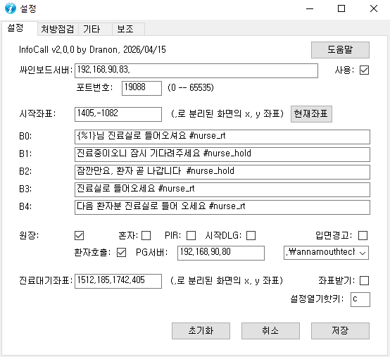 이 화면서 'PG서버'를 egRinfo 를 사용할 때 쓴 그 IP주소로 설정해 주고, [저장]을 클릭해 줍니다. '원장'이나 '환자호출'과 같은 기능은 원장들이 쓸 때 쓰는 기능이므로 사용하지 않을 때는 체크를 해제해 둡니다. '시작 DLG'는 시작할 때 나오는 다이얼로그 박스가 나오지 않게 하는 기능입니다. 싸인보드의 경우 원장이든 조무사든 쓸 수 있는 기능인데, 이에 관한 사용법은 infoCall 사용법에서 설명한다. 사용하지 않을 때는 박스 체크를 해제합니다.