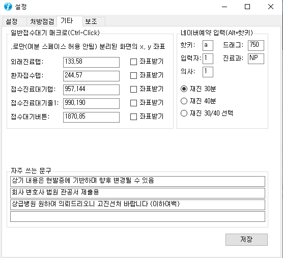 입력을 하기 위해서는 마우스커서를 위 화면의 빨간선 왼쪽에, 입력하고자 하는 환자의 이름 옆에 위치시키고, 앞 설정에서 핫키에 등록한 핫키를 눌러줍니다. 기본적으로는 'alt-a' 입니다. 그러면 환자의 이름과 예약을 확인하는 대화창이 뜨고 '확인'을 클릭하면 입려됩니다. 앞 설정에서 '드래그'에 나오는 숫자는 이 화면에서 마우스 커서가 실제로 우측으로 얼마만큼 이동하면서 정보를 긁어 분석을 할지를 결정합니다. 네이버예약 환자가 초진인지 재진인지를 판단하기 위해 사용하는 정보는 위 화면에서 환자의 이름과 전화번호이고, 예약 시각 정보는 우측에 있는 날짜와 시각입니다. 최소한 그만큼 드래그 되어야 합니다. 화면의 해상도가 1920x1080이 아닌 경우는 그 숫자를 적당히 조정해서 정보가 완전히 읽혀 질 수 있도록 해야 합니다.